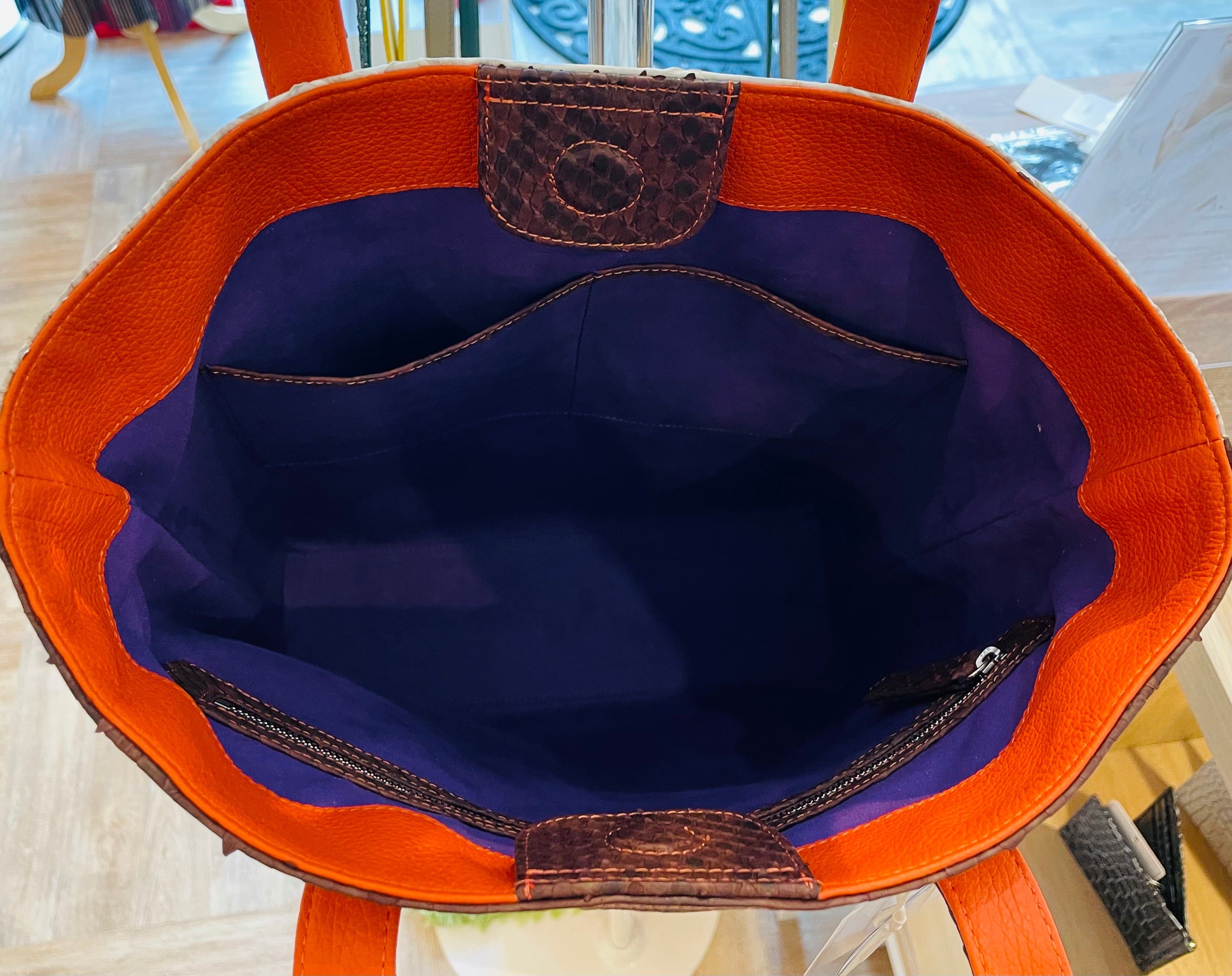 ナチュラルとブラウンの2色使いが特徴で、持ち手の裏側などには牛革のオレンジが使われています。