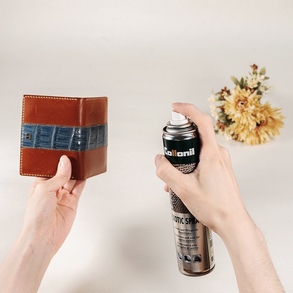 クロコダイル、リザード、パイソンなど爬虫類革をはじめ、オーストリッチやエレファントなど個性豊かなエキゾチックレザーは、ファッションアイテムに存在感のあるアクセントを添える上質な素材として、古くから利用されてきました。その美しさを長く保つためには適切なケアが不可欠です。難しいと思われがちな爬虫類革のお手入れですが、こちらのスプレーを使用すると、手軽にケアしていただけます。