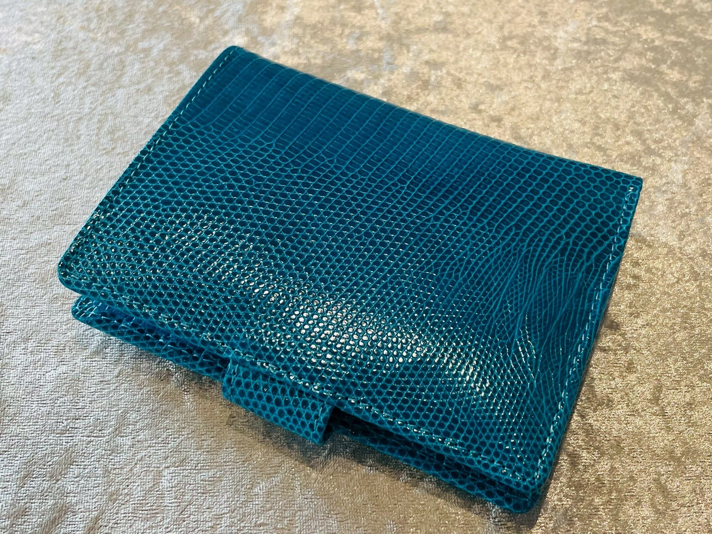 美しいリザード素材を使用した特別な二つ折ウォレットです。綺麗なターチェスが手元をスタイリッシュに演出し、日常使いや特別なシーンでの活躍が期待されます。シンプルなデザインながら、どのようなスタイルにも合わせやすい一品です。