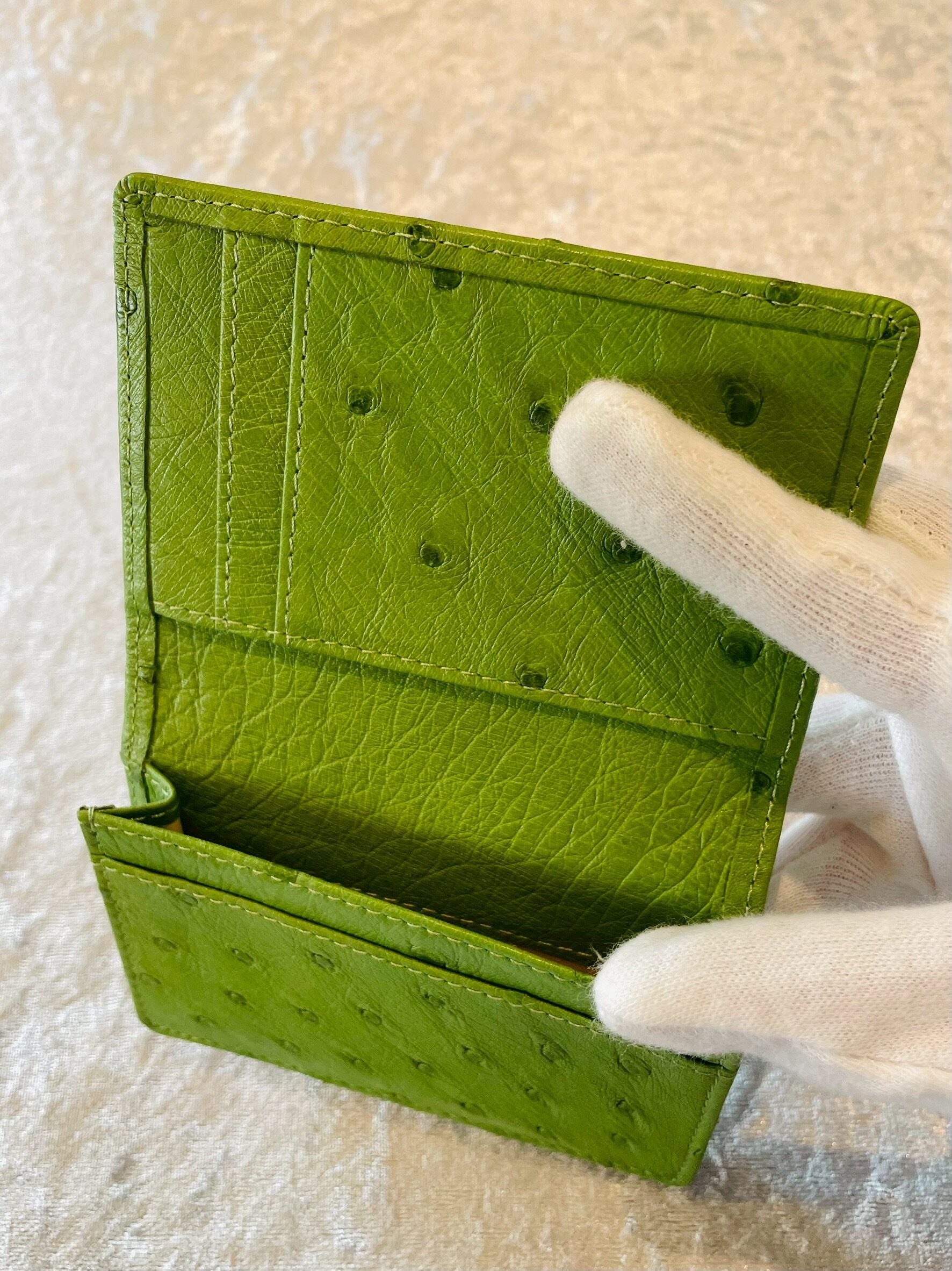 美しいオーストリッチ素材を使用した特別な名刺入れです。エレガントなコナリスグリーンカラーが手元を華やかに演出し、ビジネスシーンや特別なシーンでの活躍が期待されます。シンプルでありながらスタイリッシュなデザインは、どのスタイルにも自然に調和します。