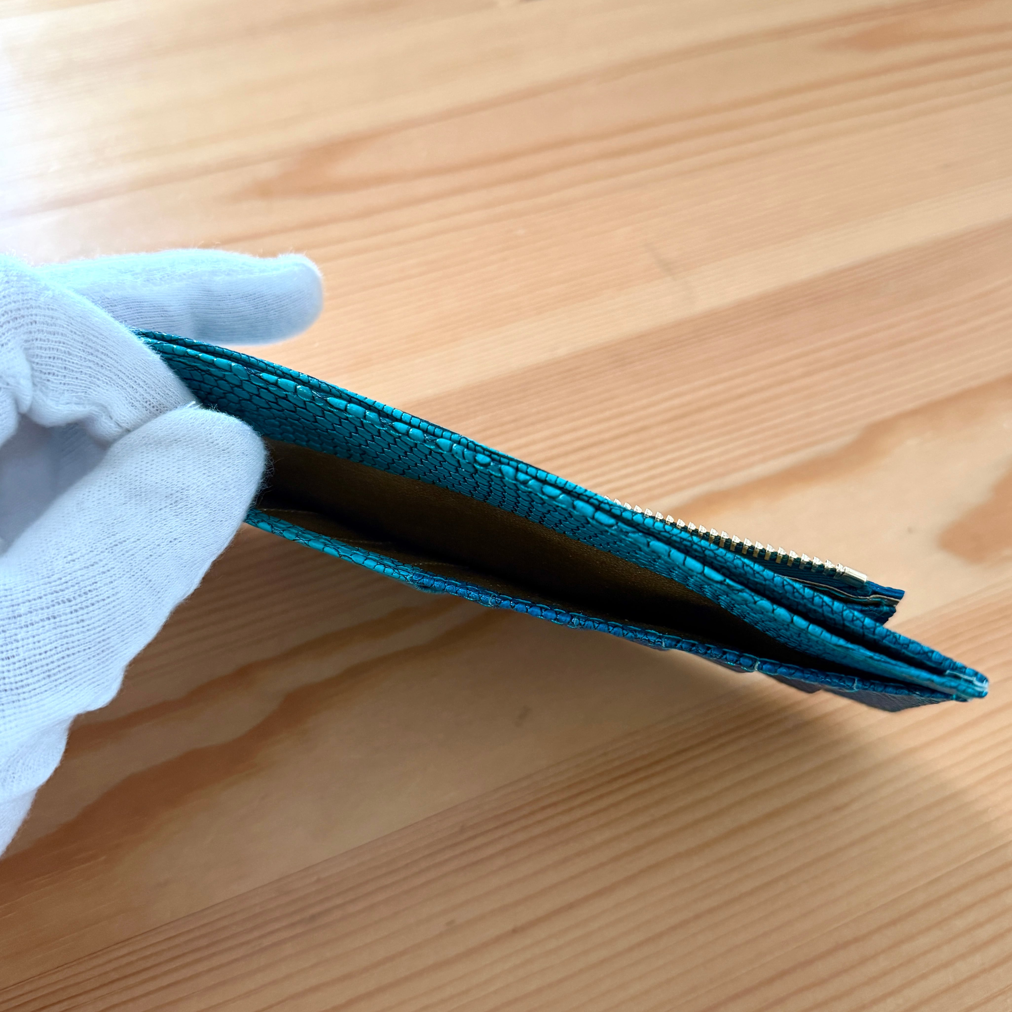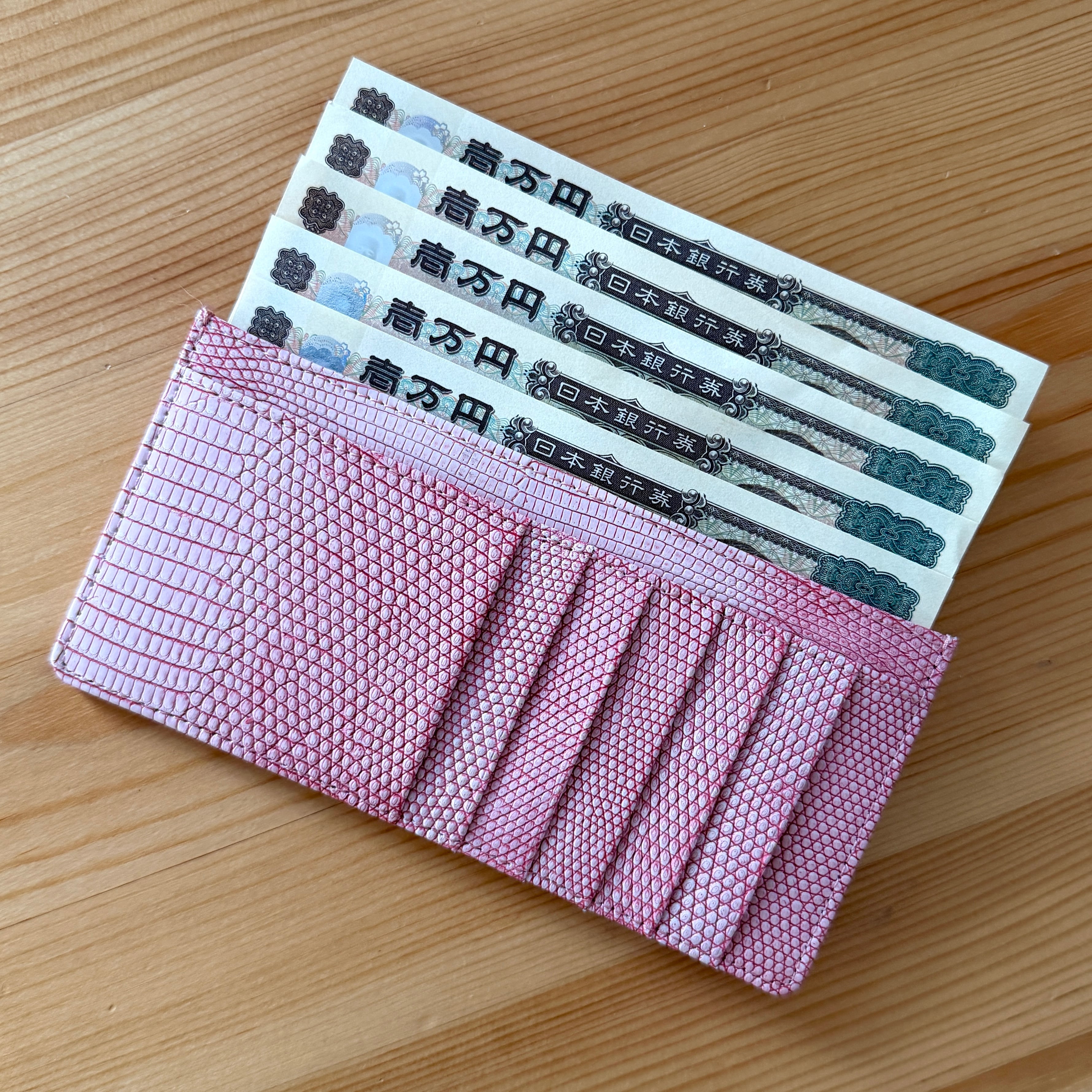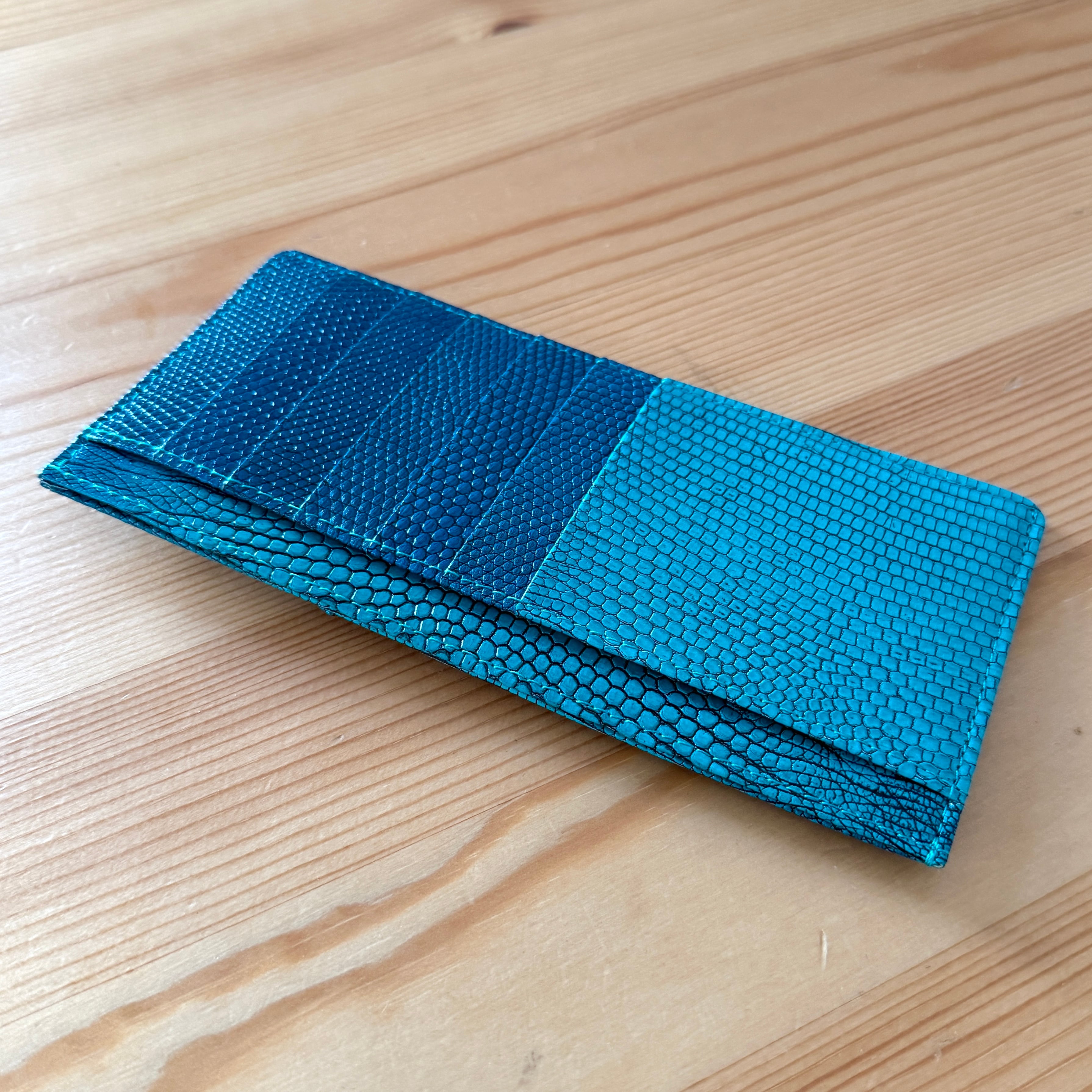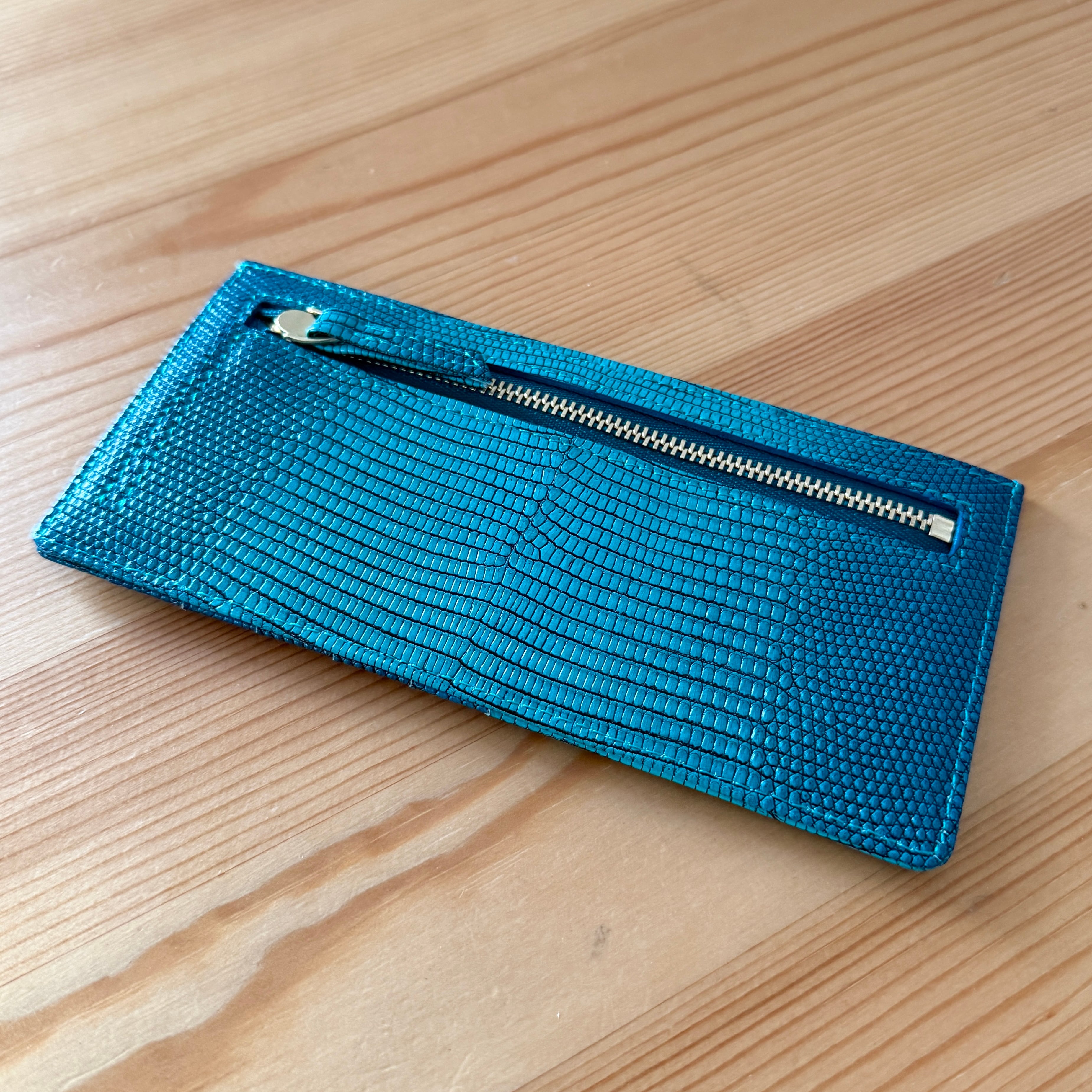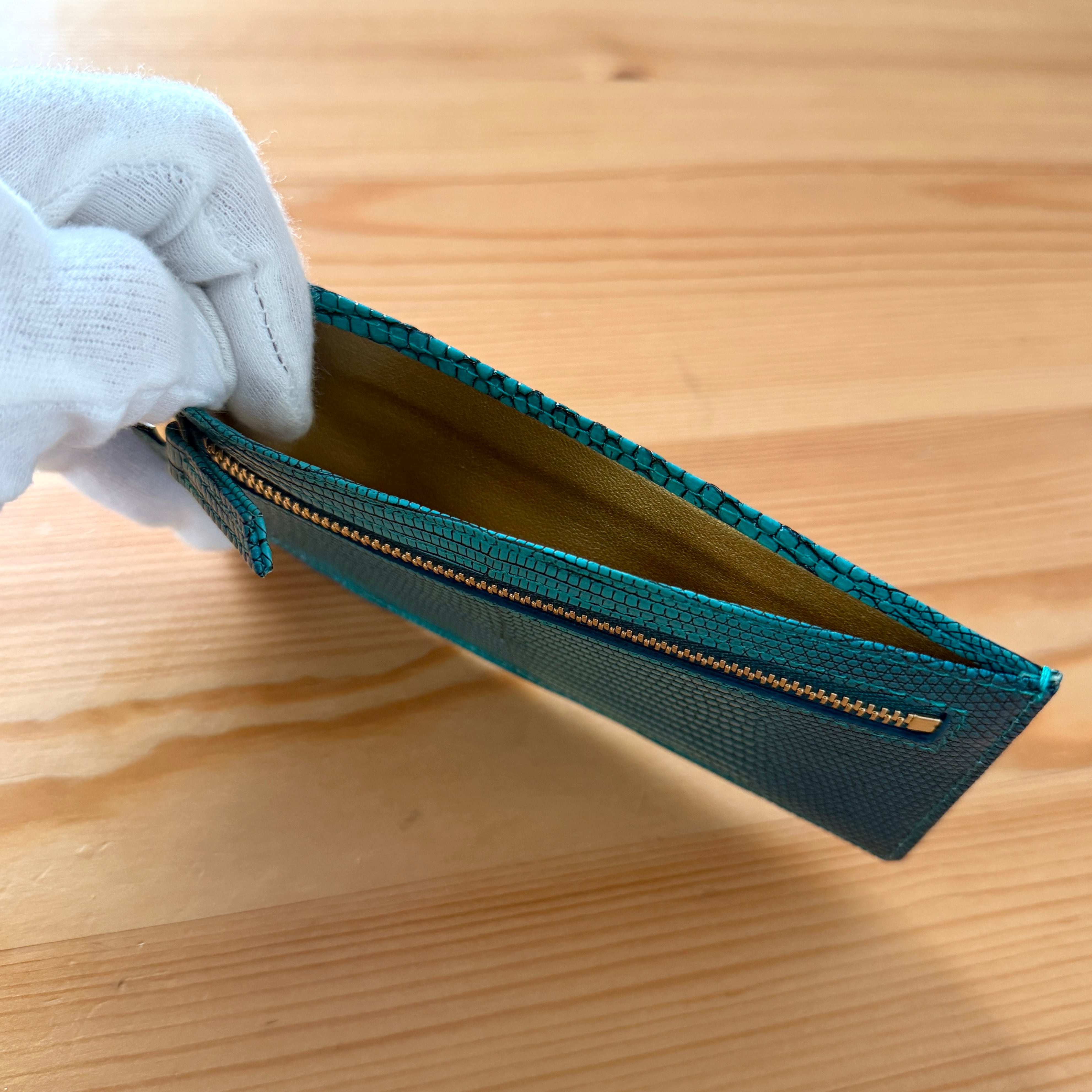 厳選されたリザード革を使用したスリムケース(超薄型財布)です。美しいエメラルドグリーンの色合いが特徴で、洗練された印象を与えます。薄型ながらも高い収納力を誇り、お札やカード類、コインをスマートに整理することができます。普段使いや特別な場面でも大活躍間違いなしです。