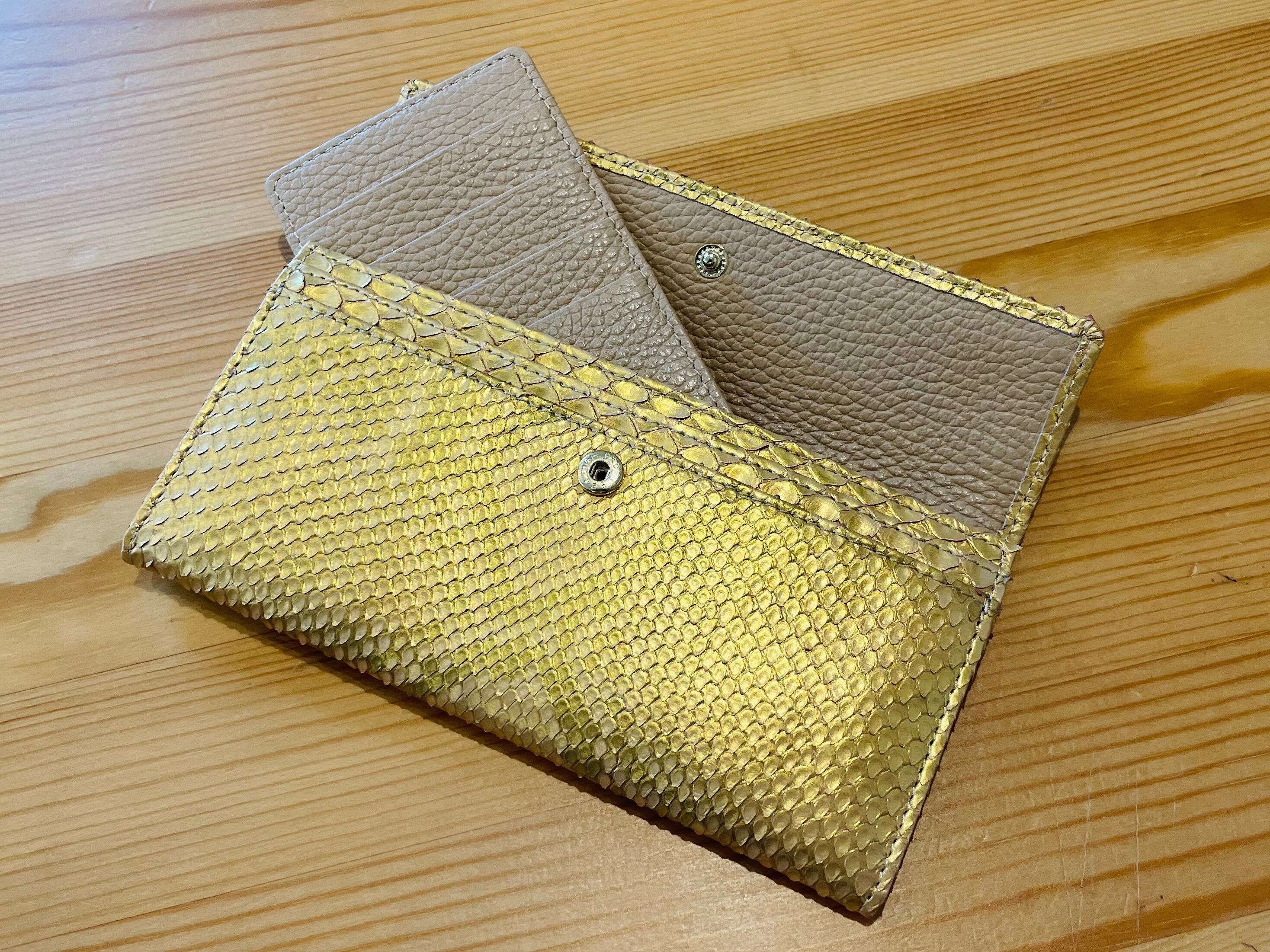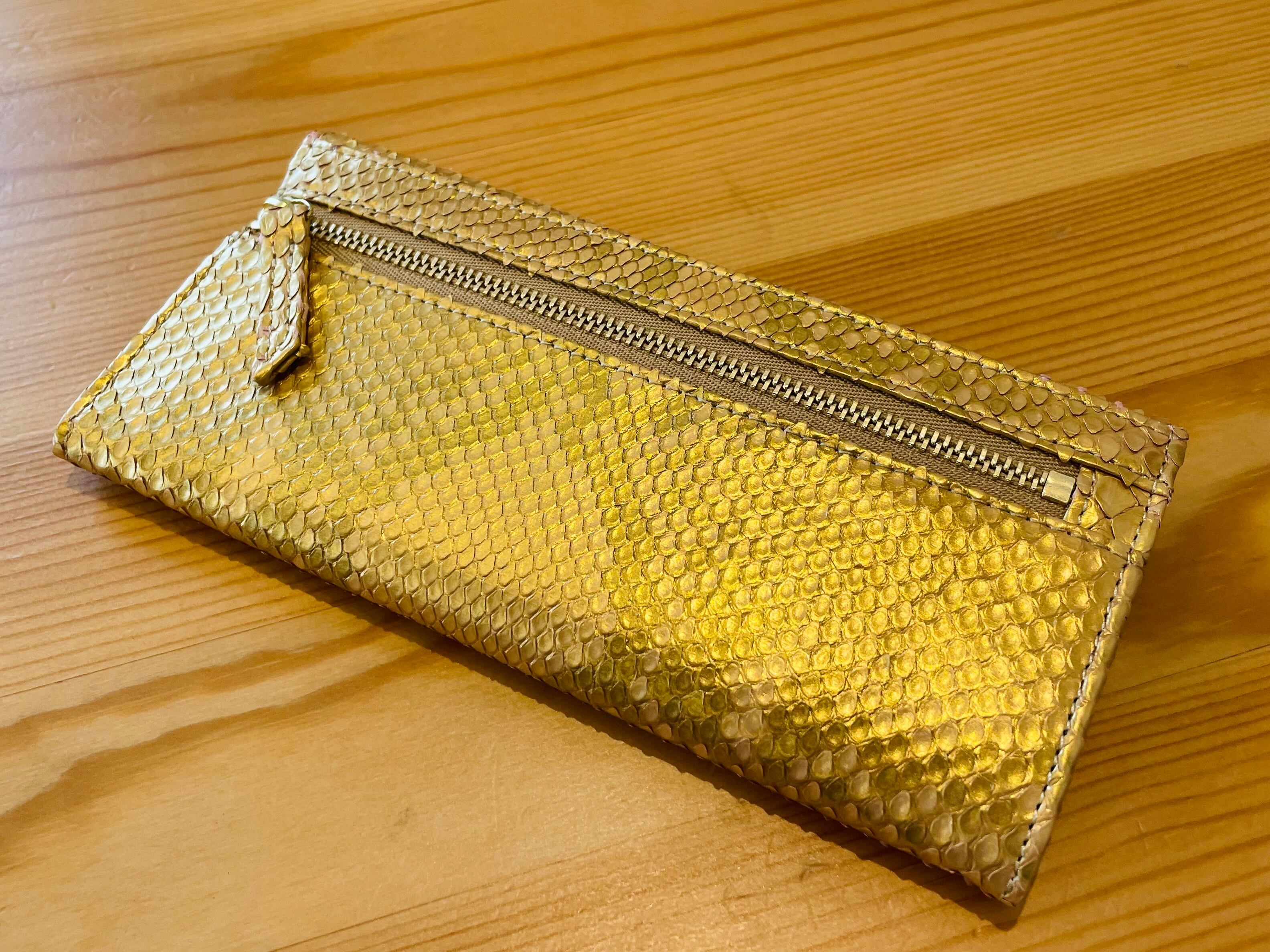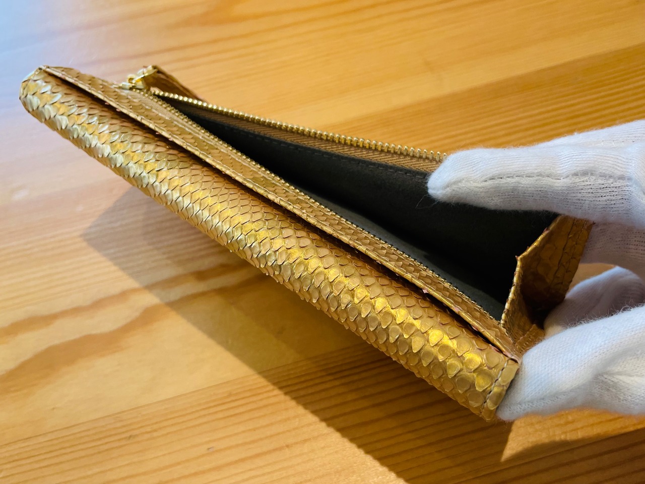 パイソンレザー(蛇革)は、古来より**「お金が身につく」「運気が上昇する」**と言われる縁起物です。その中でも、太陽のような輝きを放つゴールドカラーは、持つだけで背筋が伸びるような特別なパワーを秘めています。