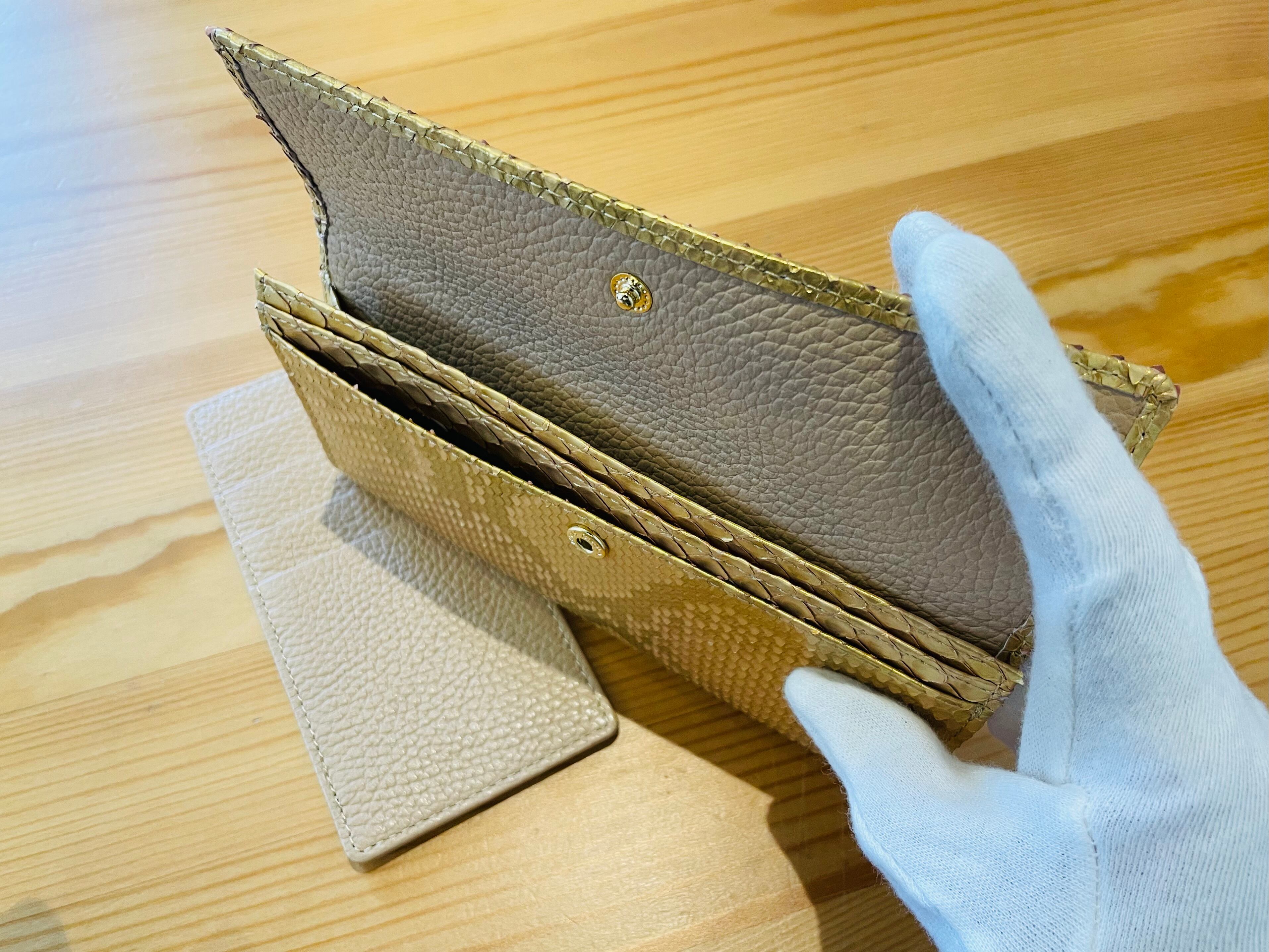 • 洗練されたサイズ感:1万円札を美しく収めつつ、厚みを抑えたスタイリッシュなフォルム。手に持った時のフィット感は、パイソンレザー特有のしなやかさがあってこそ。